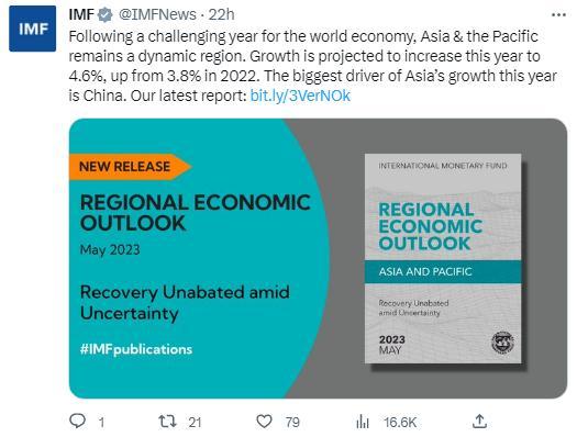 國際貨幣基金組織(IMF)5月2日發(fā)布《亞洲及太平洋地區(qū)經(jīng)濟展望報告》,圖片來源:國際貨幣基金組織社交媒體截圖