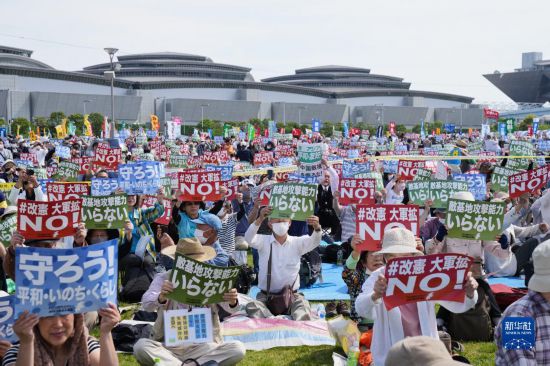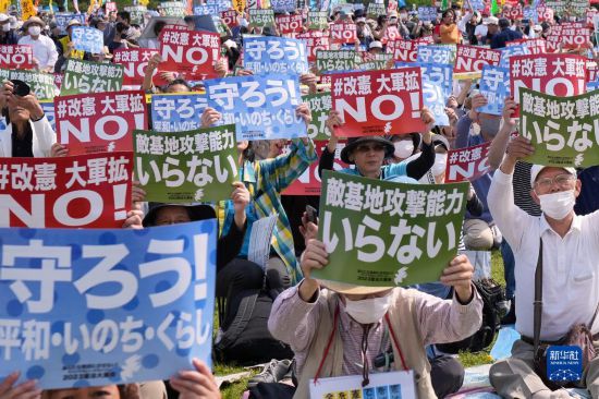 5月3日是日本憲法紀念日。當天,約2.5萬名日本民眾聚集在東京有明防災公園的廣場上,舉行了守護憲法集會,他們打出守護憲法、反對強軍擴武、不要反擊能力、反對修改憲法等內容的標語和旗幟,呼吁守護憲法、守護和平。
