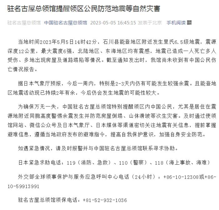 為確保萬無一失,中國駐名古屋總領(lǐng)館特別提醒領(lǐng)區(qū)內(nèi)中國公民,尤其是居住在震源地附近同胞高度警惕余震發(fā)生并防范房屋倒塌、山體滑坡等次生災(zāi)害。及時通過使領(lǐng)館網(wǎng)站、微信公眾號及日本氣象廳、日本媒體等渠道密切關(guān)注地震有關(guān)信息,提前掌握避難信息,遵循當?shù)卣l(fā)布的避難指令,提高自我保護意識,加強自身安全防范。