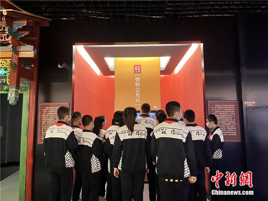 運用現(xiàn)代科技手段展示的彌勒會見記受到學生的關注和喜愛。新疆哈密市博物館 供圖