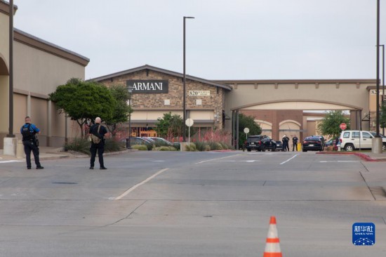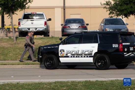 這是5月6日在美國得克薩斯州達(dá)拉斯近郊發(fā)生槍擊事件的購物中心拍攝的警察和警車。美國得克薩斯州達(dá)拉斯近郊一家購物中心6日發(fā)生槍擊事件。新華社發(fā)(田丹攝)
