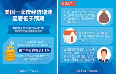 近日,美國商務(wù)部經(jīng)濟(jì)分析局?jǐn)?shù)據(jù)顯示,美國2023年一季度GDP年化環(huán)比增長1.1%,大幅低于市場預(yù)期的2%,較去年四季度2.6%的增幅有所回落,已連續(xù)兩個季度放緩?!度A爾街日報》網(wǎng)站報道稱,在通貨膨脹仍然高企、利率不斷上升的情況下,美國第一季度經(jīng)濟(jì)增長下滑,增加了人們對今年晚些時候可能出現(xiàn)經(jīng)濟(jì)衰退的擔(dān)憂。