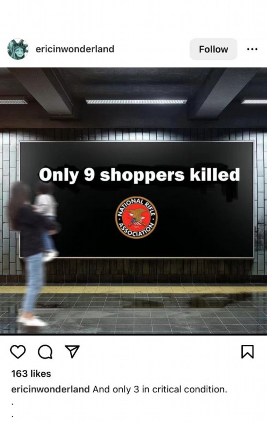 網(wǎng)友Ericinwonderland創(chuàng)作了一則帶有美國步槍協(xié)會標(biāo)識的“廣告”,上面寫道:“只死了9個。”