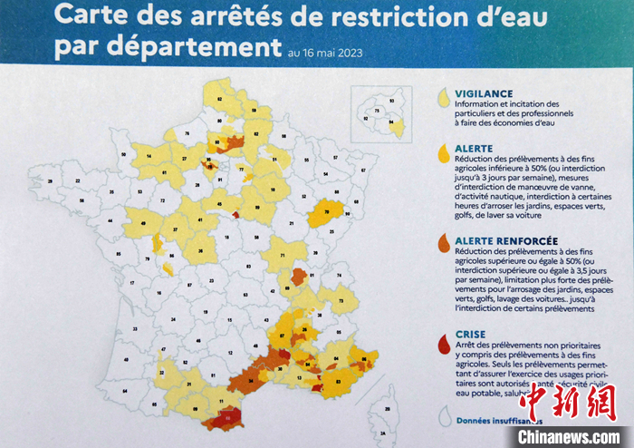 法國官方本周發(fā)表的一份最新報(bào)告顯示,法國今年炎熱干旱和水資源短缺問題可能比去年更加嚴(yán)重。報(bào)告公布的地圖標(biāo)明了需要限制用水的省份。 中新社記者 李洋 攝