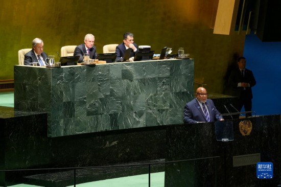 6月1日,在位于紐約的聯(lián)合國(guó)總部,特立尼達(dá)和多巴哥常駐聯(lián)合國(guó)代表丹尼斯·弗朗西斯(前)當(dāng)選第78屆聯(lián)合國(guó)大會(huì)主席后發(fā)表講話。新華社發(fā)(聯(lián)合國(guó)供圖/洛伊·費(fèi)利普攝)