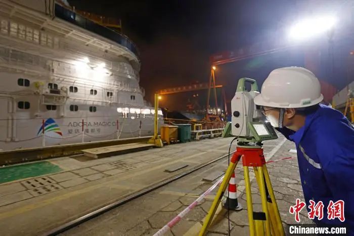 6月1日凌晨2時(shí),中國首艘國產(chǎn)大型郵輪“愛達(dá)·魔都號”開始注水起浮,工作人員對船體相關(guān)數(shù)據(jù)進(jìn)行檢測。殷立勤 攝