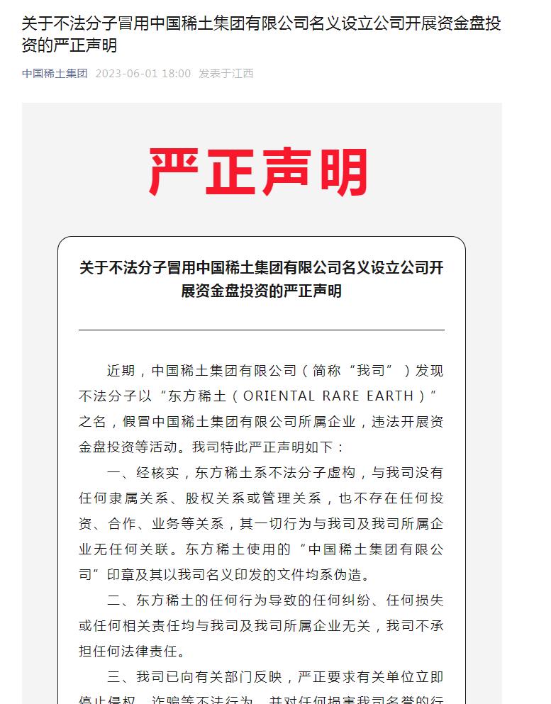“中國(guó)稀土集團(tuán)”微信公眾號(hào)曾在6月1日發(fā)布嚴(yán)正聲明提醒,近期,中國(guó)稀土集團(tuán)有限公司(下稱“中國(guó)稀土”)發(fā)現(xiàn)不法分子以“東方稀土(ORIENTAL RARE EARTH)”之名,假冒中國(guó)稀土集團(tuán)有限公司所屬企業(yè),違法開展資金盤投資等活動(dòng)。