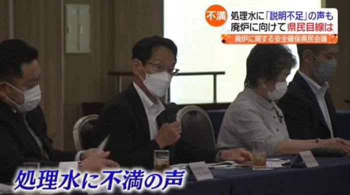 當(dāng)?shù)貢r間13日下午,日本福島縣民眾召開會議,參加者針對日本政府計劃在今夏正式向大海排放核污水一事表示不滿。圖片來源:福島中央電視臺視頻截圖