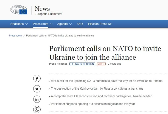 歐洲議會(huì)呼吁北約邀請(qǐng)烏克蘭加入。圖片來(lái)源:歐洲議會(huì)網(wǎng)站截圖