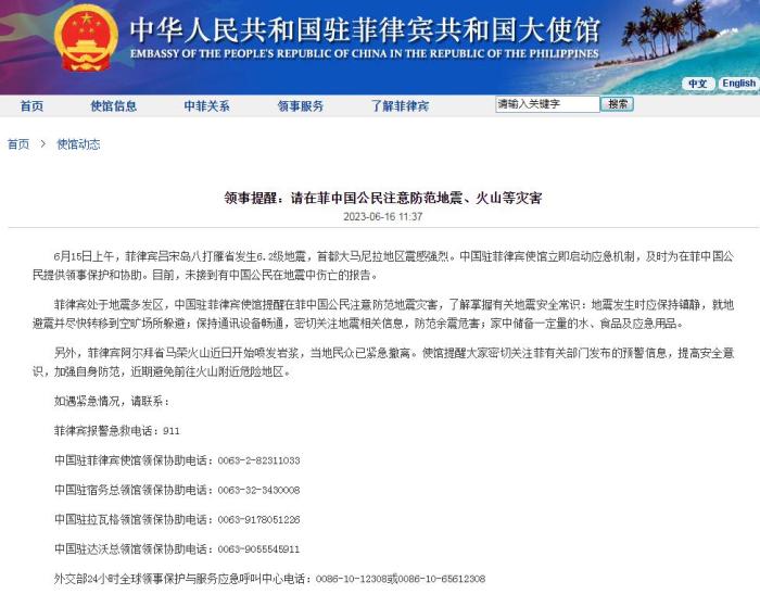 中新網(wǎng)6月16日電 據(jù)中國駐菲律賓大使館網(wǎng)站消息,6月15日上午,菲律賓呂宋島八打雁省發(fā)生6.2級地震,首都大馬尼拉地區(qū)震感強(qiáng)烈。中國駐菲律賓使館立即啟動應(yīng)急機(jī)制,及時(shí)為在菲中國公民提供領(lǐng)事保護(hù)和協(xié)助。目前,未接到有中國公民在地震中傷亡的報(bào)告。