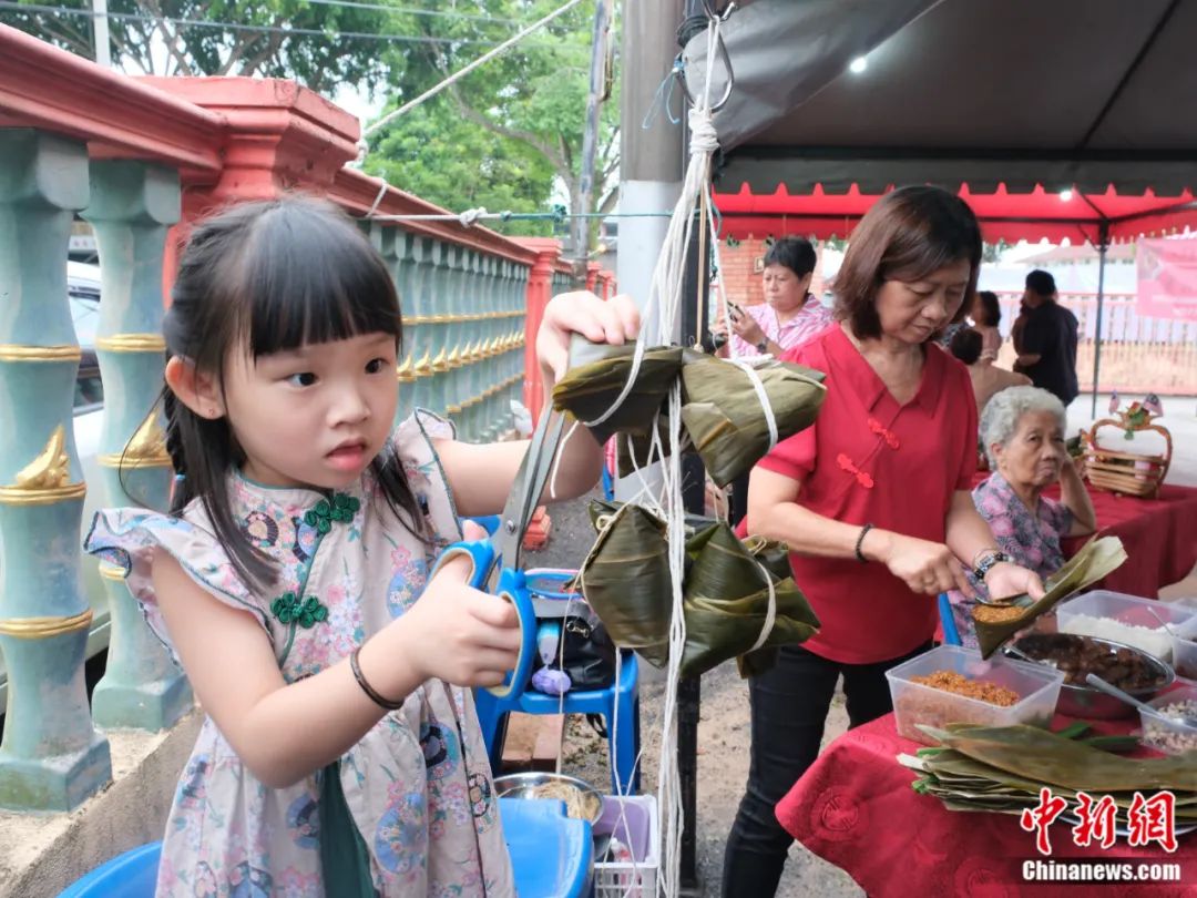 2023年6月18日,馬來西亞馬六甲舉行端午龍舟系列活動,包括游龍舟、裹粽比賽等,吸引當(dāng)?shù)馗髯逡崦癖妳⑴c。圖為有的家庭四代同堂齊上陣。奶奶在一旁包粽子,四歲的曾馨怡小朋友給包好的粽子修剪粽葉。陳悅 攝