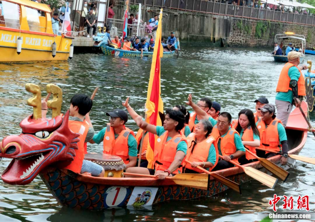 龍舟文化受到馬六甲和馬來西亞各族民眾歡迎。圖為2023年游龍舟活動6月18日開幕,很多參賽隊都由馬來裔或當(dāng)?shù)胤侨A裔民眾組成。陳悅 攝