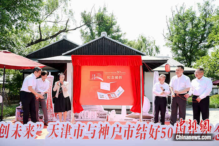 6月24日,中日嘉賓為《天津市與神戶市締結友城50周年紀念郵折》揭幕。當日,主題為“接續(xù)友好 共創(chuàng)未來”天津市與神戶市結好50周年紀念活動在天津水上公園神戶園舉行。 中新社記者 佟郁 攝