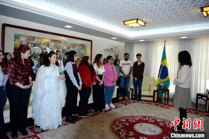 6月21日,端午開放日活動,巴西青年學子參觀總領館,前排左二為露西婭。中新社記者 林春茵 攝