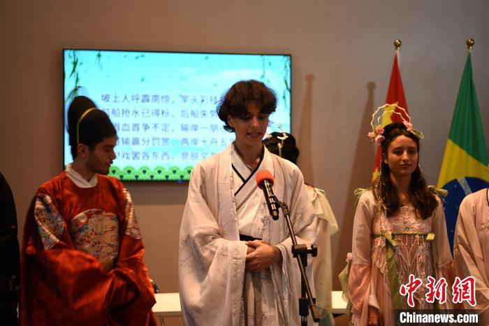當?shù)貢r間6月21日,中國駐圣保羅總領館舉行端午節(jié)開放日活動,圣保羅州立大學孔子學院40余名學生赴約而來。記者在活動上見到德卡馬戈時,一起組隊表演古詩詞朗誦的五六個同學正為他的現(xiàn)身歡呼不已。