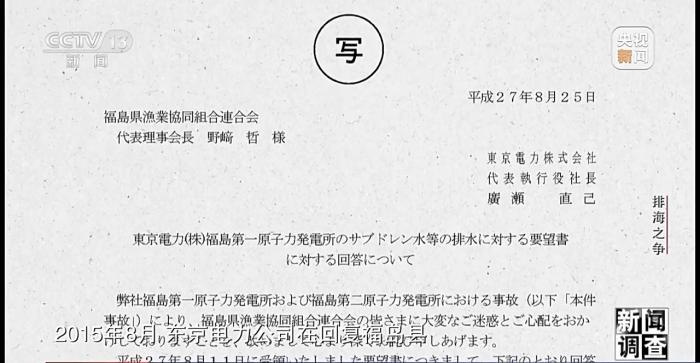 2015年8月,東京電力公司在回復(fù)福島縣漁業(yè)協(xié)作組合聯(lián)合會(huì)的請(qǐng)?jiān)笗鴷r(shí)做出書面承諾,在得到包括漁業(yè)從業(yè)者在內(nèi)的相關(guān)人員理解之前,不會(huì)對(duì)核污染水進(jìn)行任何處理。
