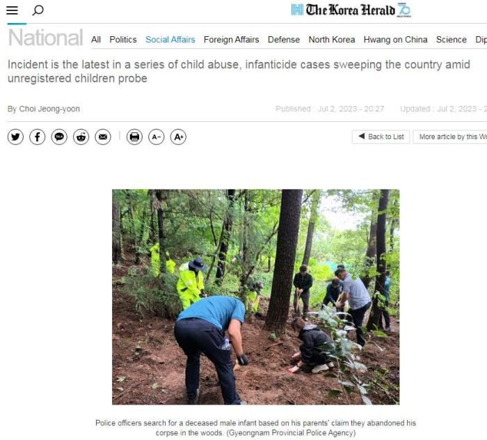 2023年7月2日,韓國慶尚南道警方稱,已向一名20多歲的男子和一名30多歲的女子發(fā)出逮捕令,原因是他們勒死了自己的孩子,并將尸體丟棄在慶尚南道巨濟附近的一條河里。