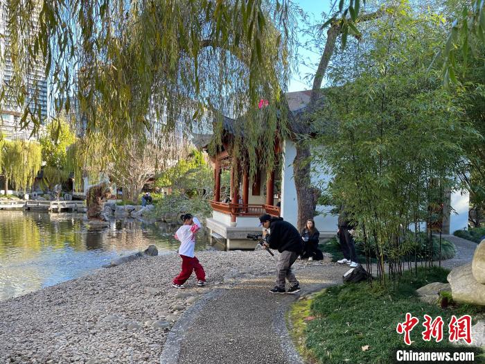 在湖邊,中國戲曲元素結(jié)合英文說唱的音樂吸引了游客們駐足。在悉尼從事汽修工作十余年的華人楊女士帶著兒子艾迪在湖邊拍攝音樂短視頻。穿著印有紅色京劇臉譜衛(wèi)衣的艾迪伴著動感音樂起舞?!拔曳浅O矚g這里中西結(jié)合的感覺。希望在公共場合拍攝能培養(yǎng)孩子的自信心?!睏钆空f。