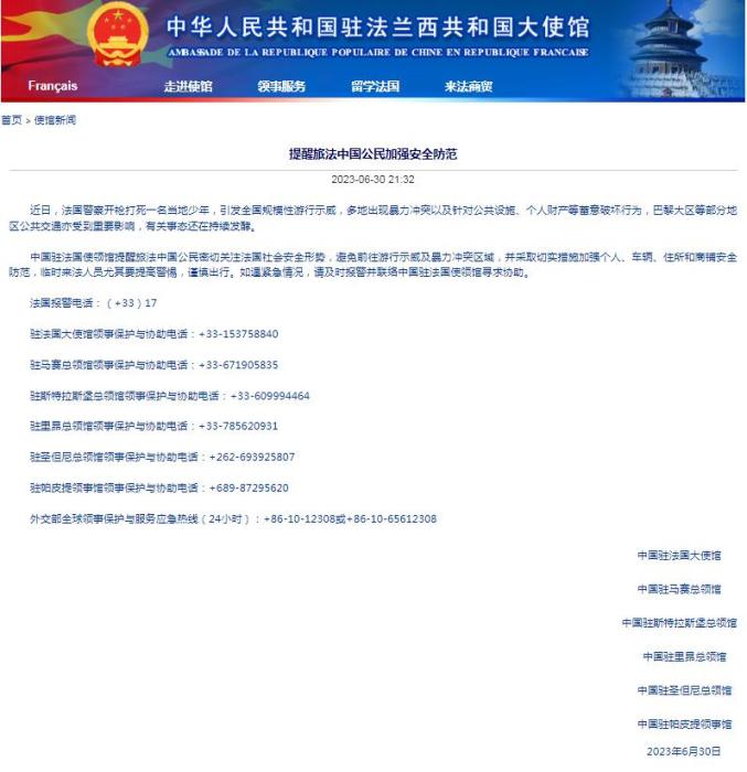 中國駐法國大使館表示,近日,法國警察開槍打死一名當(dāng)?shù)厣倌?,引發(fā)全國規(guī)模性游行示威,多地出現(xiàn)暴力沖突以及針對公共設(shè)施、個人財產(chǎn)等蓄意破壞行為,巴黎大區(qū)等部分地區(qū)公共交通亦受到重要影響,有關(guān)事態(tài)還在持續(xù)發(fā)酵。