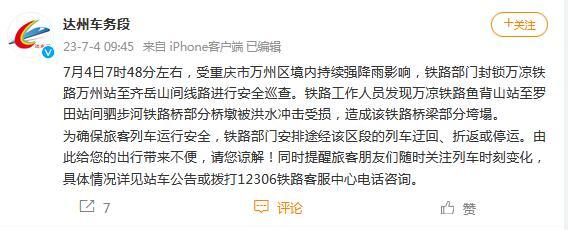 中新網(wǎng)7月4日電 據(jù)成都鐵路局達州車務(wù)段官方微博消息,7月4日7時48分左右,受重慶市萬州區(qū)境內(nèi)持續(xù)強降雨影響,鐵路部門封鎖萬涼鐵路萬州站至齊岳山間線路進行安全巡查。鐵路工作人員發(fā)現(xiàn)萬涼鐵路魚背山站至羅田站間駟步河鐵路橋部分橋墩被洪水沖擊受損,造成該鐵路橋梁部分垮塌。為確保旅客列車運行安全,鐵路部門安排途經(jīng)該區(qū)段的列車迂回、折返或停運。