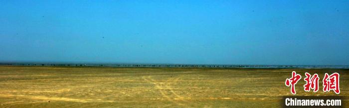 在海市蜃樓觀測(cè)點(diǎn),沙漠上出現(xiàn)一片湖面,隱約能看到湖面上波光粼粼,水波隨風(fēng)翻滾。 孜瓦爾古麗·卡德?tīng)枴z