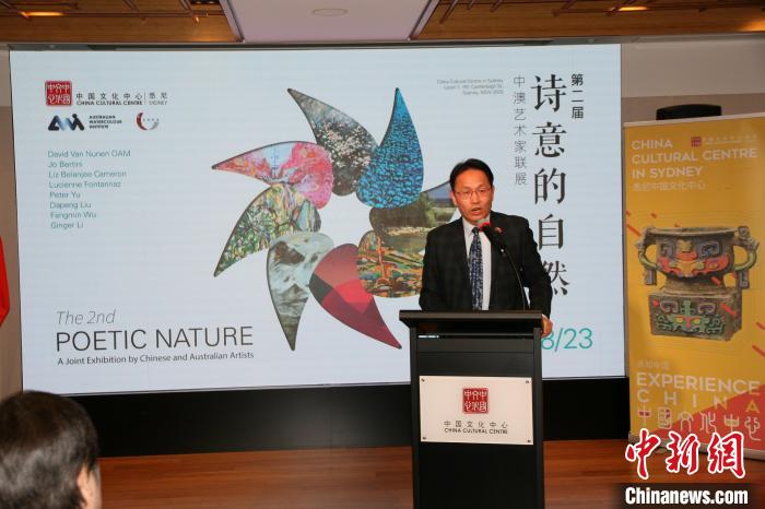當?shù)貢r間7月6日晚,第二屆“詩意的自然—中澳藝術(shù)家聯(lián)展”在悉尼開幕。圖為悉尼中國文化中心主任兼中國駐悉尼旅游辦事處主任肖夏勇在開幕式上致辭。中新社記者 顧時宏 攝