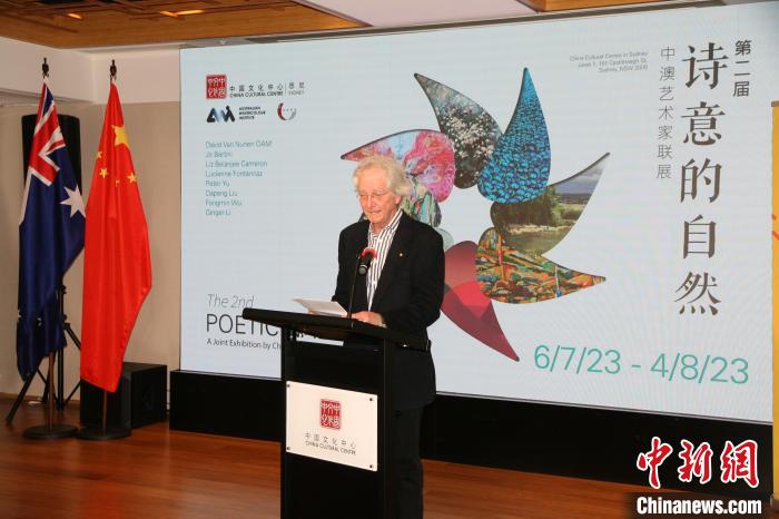 當?shù)貢r間7月6日晚,第二屆“詩意的自然—中澳藝術(shù)家聯(lián)展”在悉尼開幕。圖為澳大利亞水彩畫協(xié)會主席大衛(wèi)·范·紐恩在開幕式上致辭。中新社記者 顧時宏 攝