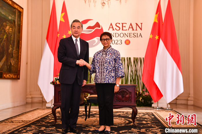 當(dāng)?shù)貢r間7月12日,中央外辦主任王毅在雅加達(dá)會見印尼外長蕾特諾。 中新社發(fā) 徐欽 攝