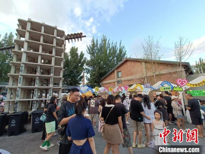 7月8日晚上8點(diǎn),盡管天色已經(jīng)暗下來(lái),但北京的地表溫度仍在30℃以上。在798藝術(shù)區(qū)南門,一處方形場(chǎng)地被分割成幾排街道,200余家商鋪聚集在這里。在臨時(shí)搭建的白色攤位前,擠滿了游客。