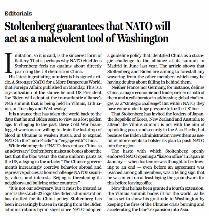 他最近的模仿是于7月10日在《外交事務(wù)》上發(fā)表題為《更強(qiáng)大的北約,應(yīng)對(duì)更危險(xiǎn)的世界》的署名文章,字里行間透露了他和美國(guó)總統(tǒng)拜登在北約峰會(huì)上的立場(chǎng)。為了固守過(guò)去,這些頭腦昏昏的冷戰(zhàn)“斗士”寧愿讓烏克蘭流盡最后一滴血,以削弱俄羅斯,并將北約擴(kuò)大到所謂“印太”地區(qū),遏制中國(guó)。