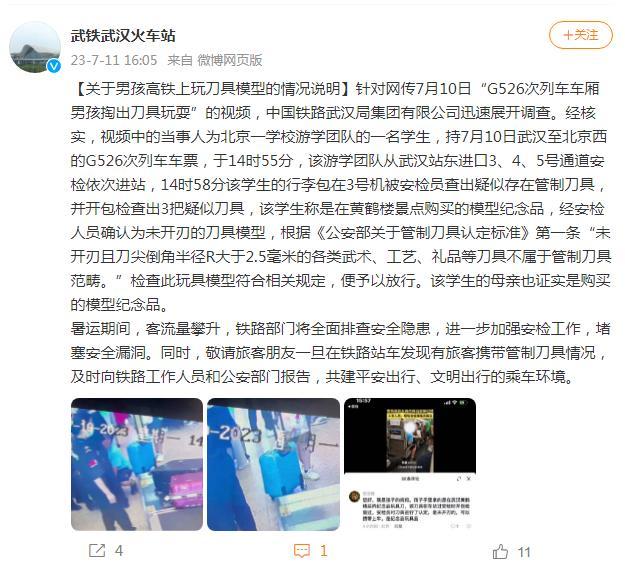經(jīng)核實(shí),視頻中的當(dāng)事人為北京一學(xué)校游學(xué)團(tuán)隊(duì)的一名學(xué)生,持7月10日武漢至北京西的G526次列車車票,于14時(shí)55分,該游學(xué)團(tuán)隊(duì)從武漢站東進(jìn)口3、4、5號(hào)通道安檢依次進(jìn)站,14時(shí)58分該學(xué)生的行李包在3號(hào)機(jī)被安檢員查出疑似存在管制刀具,并開(kāi)包檢查出3把疑似刀具,該學(xué)生稱是在黃鶴樓景點(diǎn)購(gòu)買的模型紀(jì)念品,經(jīng)安檢人員確認(rèn)為未開(kāi)刃的刀具模型,根據(jù)《公安部關(guān)于管制刀具認(rèn)定標(biāo)準(zhǔn)》第一條“未開(kāi)刃且刀尖倒角半徑R大于2.5毫米的各類武術(shù)、工藝、禮品等刀具不屬于管制刀具范疇?!睓z查此玩具模型符合相關(guān)規(guī)定,便予以放行。該學(xué)生的母親也證實(shí)是購(gòu)買的模型紀(jì)念品。