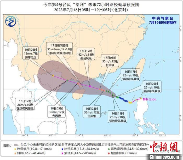 海南省氣象臺預(yù)計(jì),“泰利”中心將以每小時(shí)15公里左右的速度向西北方向移動(dòng),強(qiáng)度繼續(xù)增強(qiáng),并于17日夜間在海南文昌到廣東臺山一帶沿海登陸(臺風(fēng)級或強(qiáng)臺風(fēng)級,35~42米/秒,12~14級),之后于18日進(jìn)入北部灣,以后趨向越南北部沿海和廣西沿海。