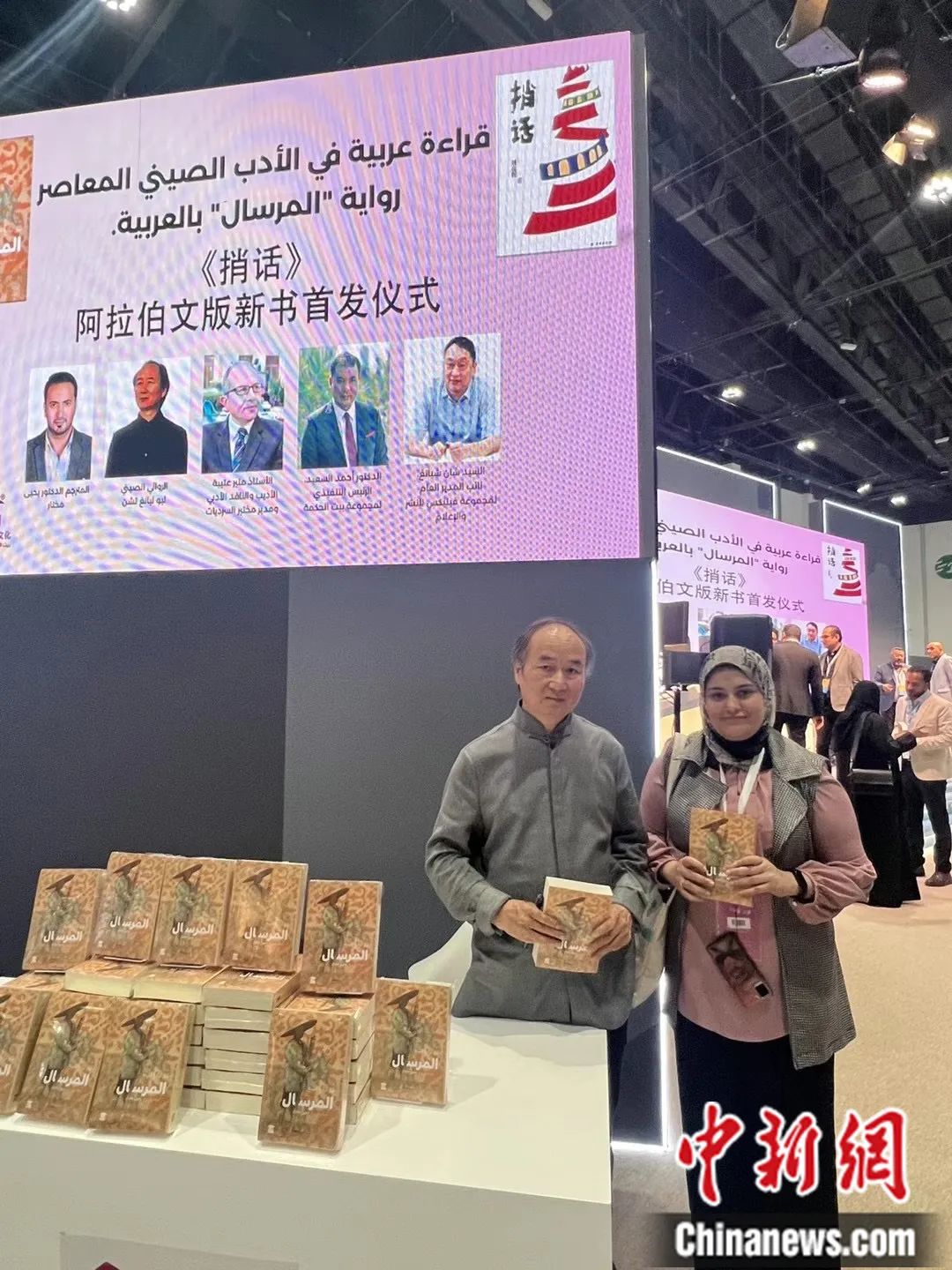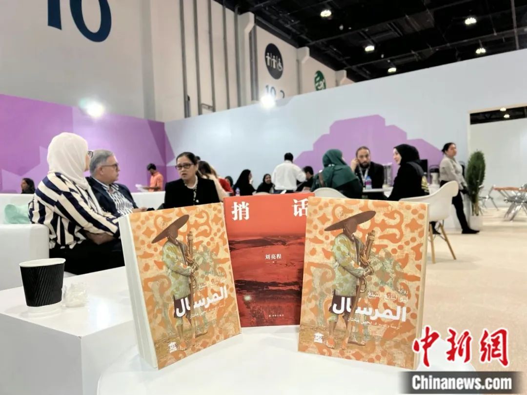 在阿布扎比國際書展上,譯林出版社與埃及??诉~特文化集團(tuán)聯(lián)合舉辦《捎話》阿拉伯文版新書首發(fā)儀式。譯林出版社 供圖