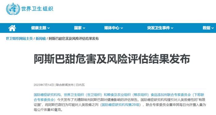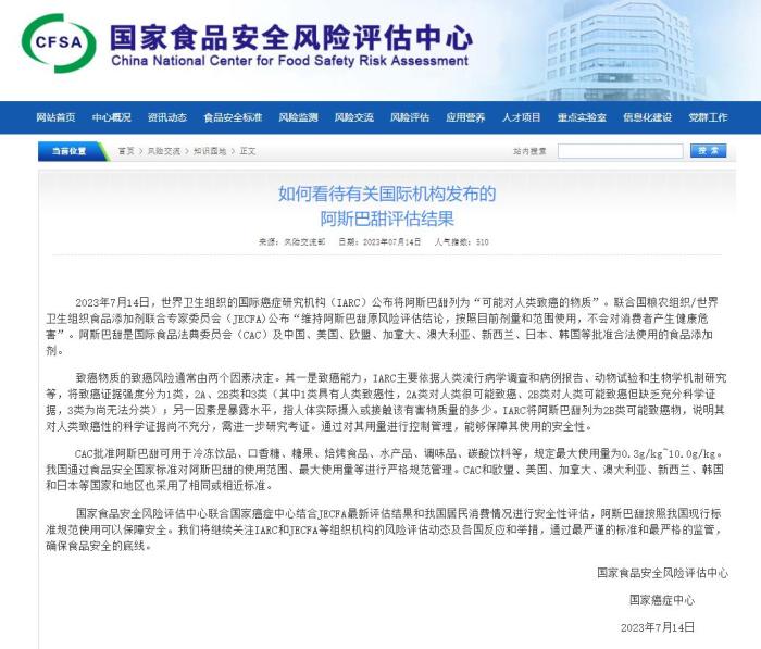 14日晚,國家食品安全風(fēng)險評估中心網(wǎng)站發(fā)布《如何看待有關(guān)國際機構(gòu)發(fā)布的阿斯巴甜評估結(jié)果》。