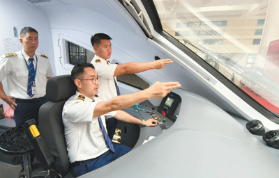 4月13日,在老撾萬(wàn)象站,中老雙方司機(jī)在首列萬(wàn)象至昆明的中老鐵路國(guó)際旅客列車(chē)上為發(fā)車(chē)做準(zhǔn)備。