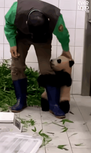“福寶”抱著飼養(yǎng)員的腿撒嬌。(來(lái)源:愛寶樂(lè)園官方社交平臺(tái)賬號(hào))