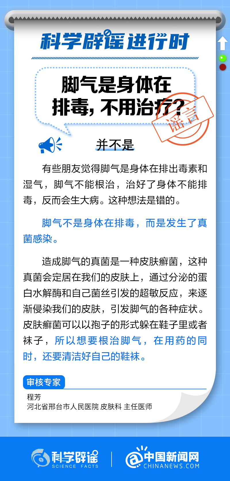 有些朋友覺(jué)得腳氣是身體在排出毒素和濕氣,腳氣治好了身體不能排毒,反而會(huì)生大病。這種想法是錯(cuò)的!腳氣不是身體在排毒,而是發(fā)生了真菌感染。(來(lái)源:@科學(xué)辟謠 @中國(guó)新聞網(wǎng) )