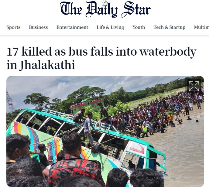 據(jù)報(bào)道,當(dāng)?shù)貢r(shí)間22日上午約9:45分,在達(dá)卡以南約200公里的恰洛加蒂縣,一輛大巴掉入水中。當(dāng)?shù)鼐椒Q(chēng),死者中包括至少8名婦女和3名兒童。