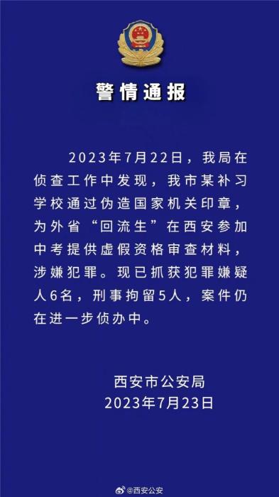 中新網(wǎng)7月23日電 據(jù)陜西省西安市公安局官方微博消息,西安市公安局23日發(fā)布警情通報(bào)稱,2023年7月22日,該局在偵查工作中發(fā)現(xiàn),西安市某補(bǔ)習(xí)學(xué)校通過偽造國家機(jī)關(guān)印章,為外省“回流生”在西安參加中考提供虛假資格審查材料,涉嫌犯罪?,F(xiàn)已抓獲犯罪嫌疑人6名,刑事拘留5人,案件仍在進(jìn)一步偵辦中。