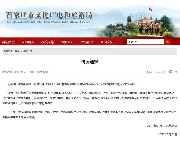 經(jīng)查,河北紅糖文化傳播有限公司(“紅糖LIVEHOUSE”)在7月22日商業(yè)演出中存在“危害社會(huì)公德”等問題,造成不良社會(huì)影響。石家莊市文化廣電和旅游局依據(jù)《營業(yè)性演出管理?xiàng)l例》,責(zé)令該公司立即停業(yè)整頓,并依法對其作出警告、罰款20萬元的行政處罰;同時(shí)對涉事樂隊(duì)嚴(yán)厲訓(xùn)誡。公安機(jī)關(guān)依據(jù)《治安管理處罰法》,已對涉事歌手丁某行政拘留。