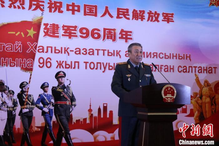 當?shù)貢r間7月28日晚,哈薩克斯坦阿斯塔納,中國駐哈薩克斯坦大使館隆重舉行慶祝中國人民解放軍建軍96周年招待會。圖為哈國防部副部長卡馬列特季諾夫中將致辭?! ≈行戮W(wǎng)記者 張碩 攝