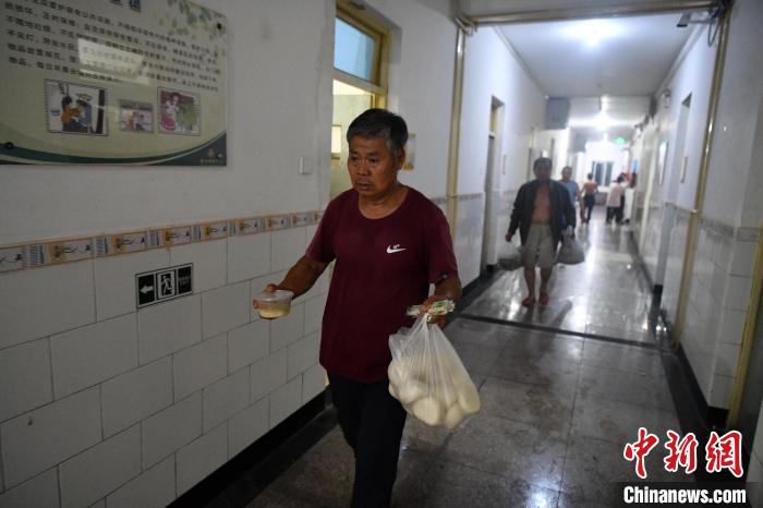 這是一間有八張床位的學(xué)生宿舍,屋頂?shù)碾娚纫恢贝抵?。?dāng)記者走進(jìn)房間時(shí),劉玉霞正吃著丈夫剛領(lǐng)回的盒飯。“一個(gè)是白菜粉條,一個(gè)是木須肉,還有湯,挺好。”在老人看來(lái),雨天里吃口熱飯,“家人平安已知足”。