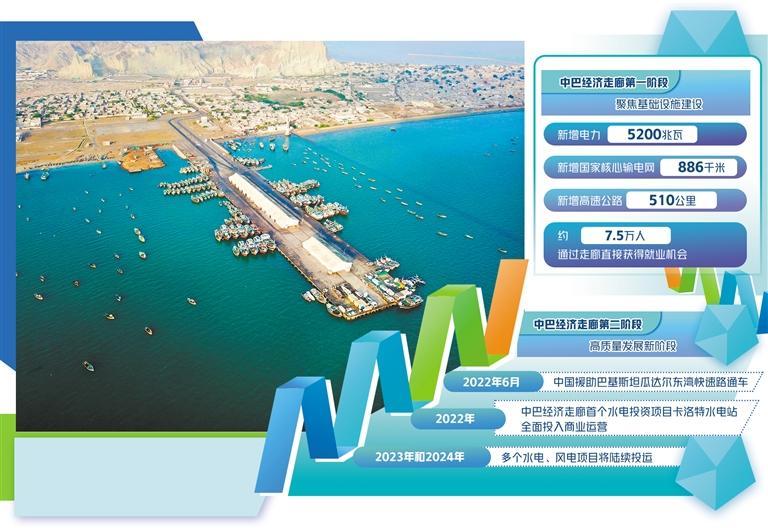 當(dāng)前正處于中巴經(jīng)濟(jì)走廊建設(shè)的第二階段,這也是至關(guān)重要的高質(zhì)量發(fā)展新階段。中巴雙方在走廊框架下,進(jìn)一步加強(qiáng)巴國工業(yè)化進(jìn)程、人力資源培訓(xùn)和產(chǎn)業(yè)園區(qū)建設(shè),在扶貧、醫(yī)療、農(nóng)業(yè)以及互聯(lián)網(wǎng)等眾多與民生息息相關(guān)的領(lǐng)域持續(xù)深化合作,力求創(chuàng)造更多就業(yè)機(jī)會,不斷推動巴基斯坦的經(jīng)濟(jì)和社會現(xiàn)代化發(fā)展,造福當(dāng)?shù)孛癖姟?022年6月,中國援助巴基斯坦瓜達(dá)爾東灣快速路通車,打通了瓜達(dá)爾港和卡拉奇之間的交通運(yùn)輸通道。同年,中巴經(jīng)濟(jì)走廊首個(gè)水電投資項(xiàng)目——卡洛特水電站全面投入商業(yè)運(yùn)營,每年將向巴基斯坦提供32億千瓦時(shí)廉價(jià)清潔電能,滿足當(dāng)?shù)?00萬人用電需求,每年可節(jié)約標(biāo)準(zhǔn)煤約140萬噸,減少二氧化碳排放350萬噸。今明兩年,走廊框架下的多個(gè)水電、風(fēng)電項(xiàng)目將陸續(xù)投運(yùn),未來巴基斯坦在清潔能源領(lǐng)域大有可為。