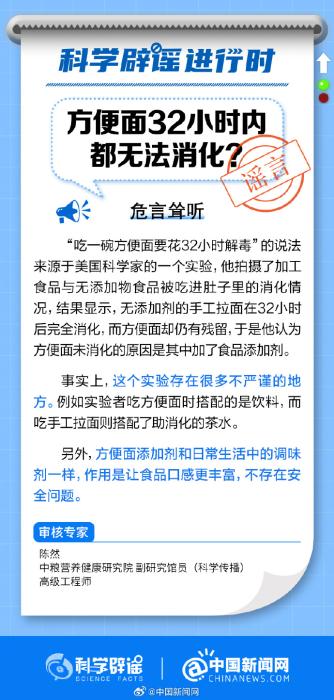 中新網(wǎng)8月1日電 “吃一碗方便面要花32小時解毒”的說法來源于美國科學(xué)家的一個實(shí)驗,但這個實(shí)驗存在很多不嚴(yán)謹(jǐn)?shù)牡胤?。方便面添加劑和日常生活中的調(diào)味劑一樣,作用是讓食品口感更豐富,不存在安全問題。(來源:@科學(xué)辟謠 @中國新聞網(wǎng) )