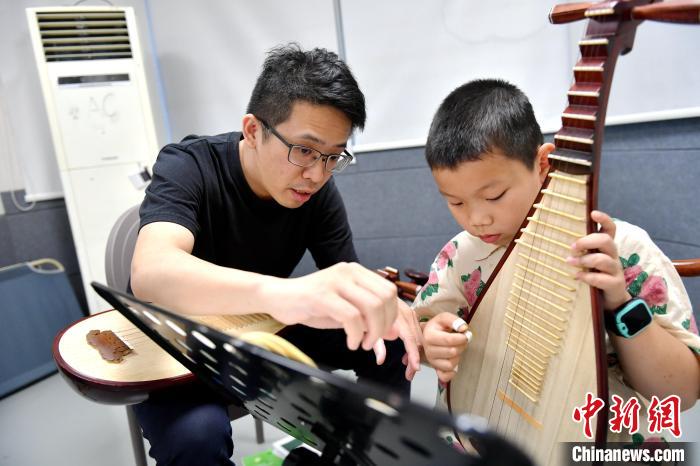 中新網(wǎng)福州8月2日電 (葉秋云)“左手大拇指不要太靠后”“手移動的時候,手臂要跟著移動,彈的時候才不會怪怪的”……從演奏姿勢、轉(zhuǎn)腕到手指的彈挑,魏辰運手把手指導(dǎo)著一位8歲小男孩彈琵琶。