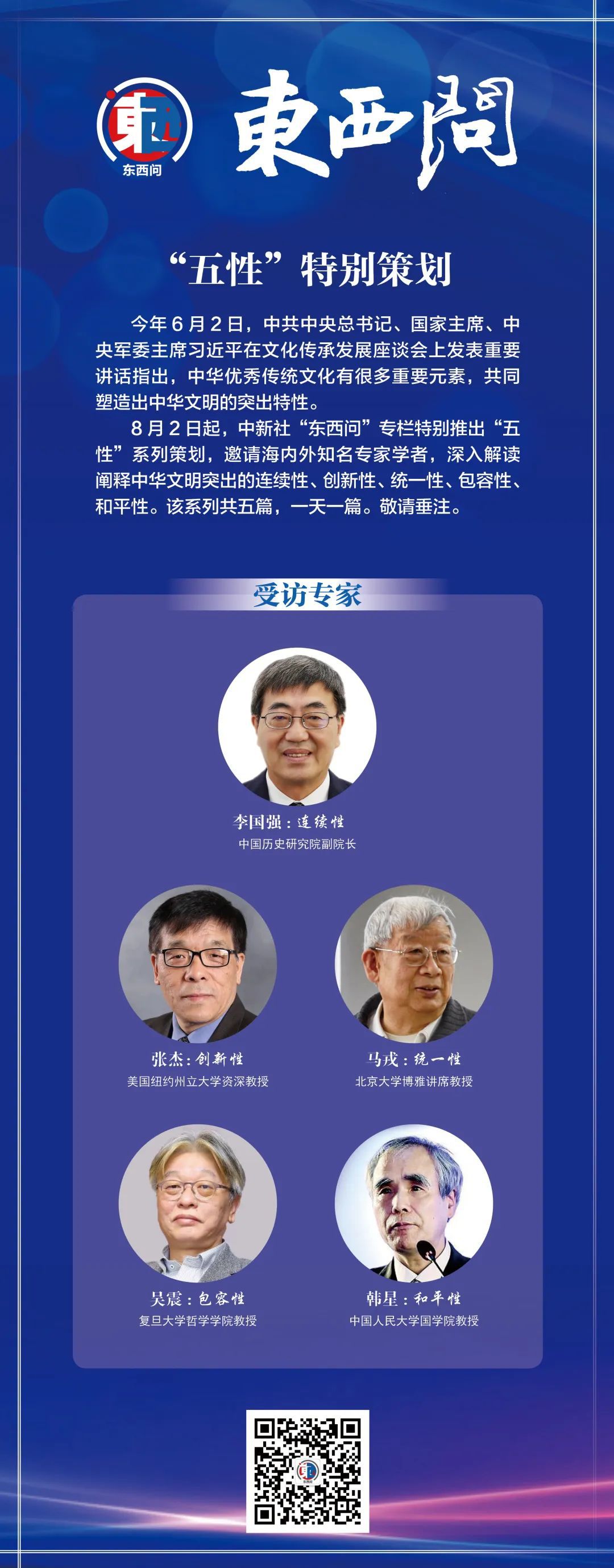 8月2日起,中新社“東西問(wèn)”專欄特別推出“五性”系列策劃,邀請(qǐng)海內(nèi)外知名專家學(xué)者,深入解讀闡釋中華文明突出的連續(xù)性、創(chuàng)新性、統(tǒng)一性、包容性、和平性。該系列共五篇,一天一篇。敬請(qǐng)垂注。