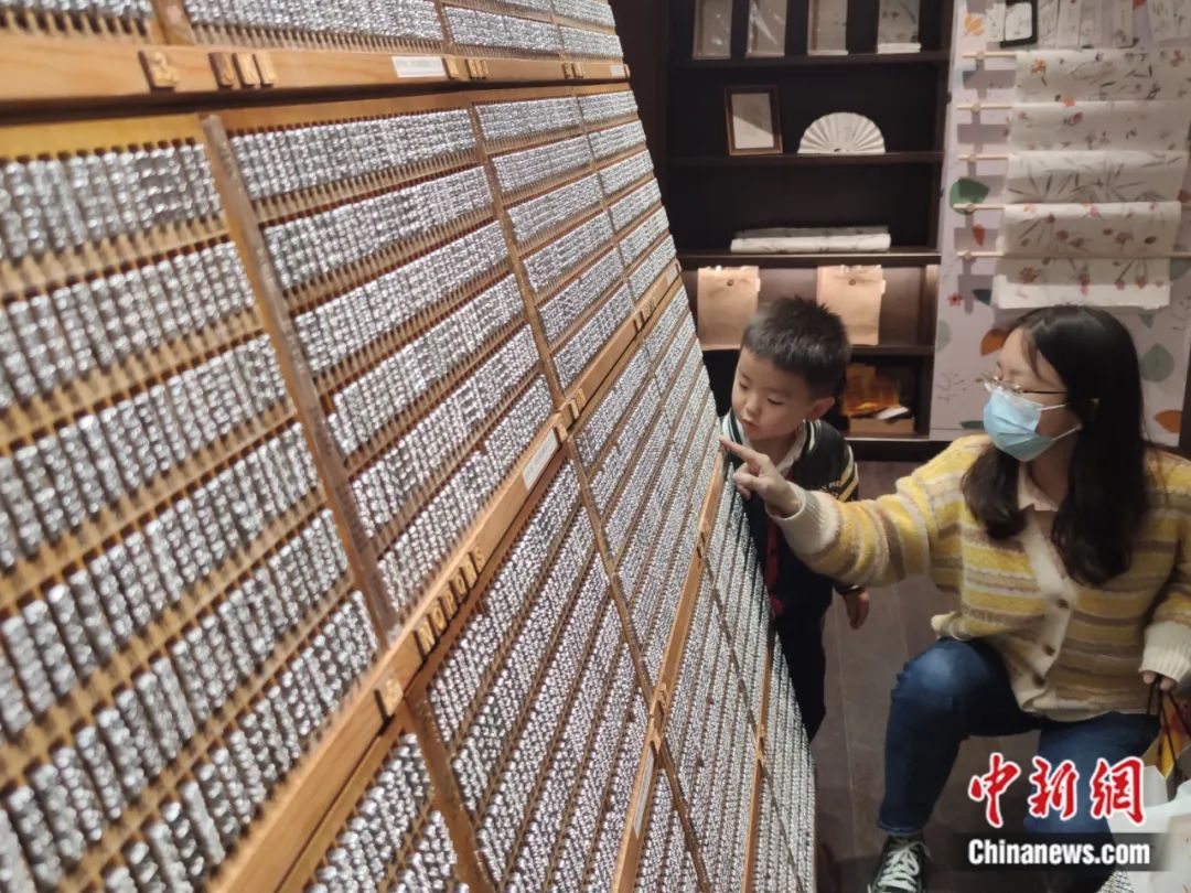 湖北武漢一書(shū)店內(nèi),一位母親給兒子講述中國(guó)古代四大發(fā)明之一印刷術(shù)的故事。李長(zhǎng)林 攝