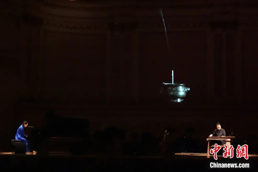 2023年7月1日,“紐約中美青年音樂(lè)節(jié)”在美國(guó)紐約卡內(nèi)基音樂(lè)廳舉行,來(lái)自中國(guó)和美國(guó)的青年音樂(lè)人演奏新國(guó)樂(lè)、實(shí)驗(yàn)世界音樂(lè)、實(shí)驗(yàn)民謠、新爵士樂(lè),吸引當(dāng)?shù)赜^眾聆聽(tīng)。圖為音樂(lè)人巫娜(右)與李帶菓以古琴和鋼琴演奏新國(guó)樂(lè)。廖攀 攝
