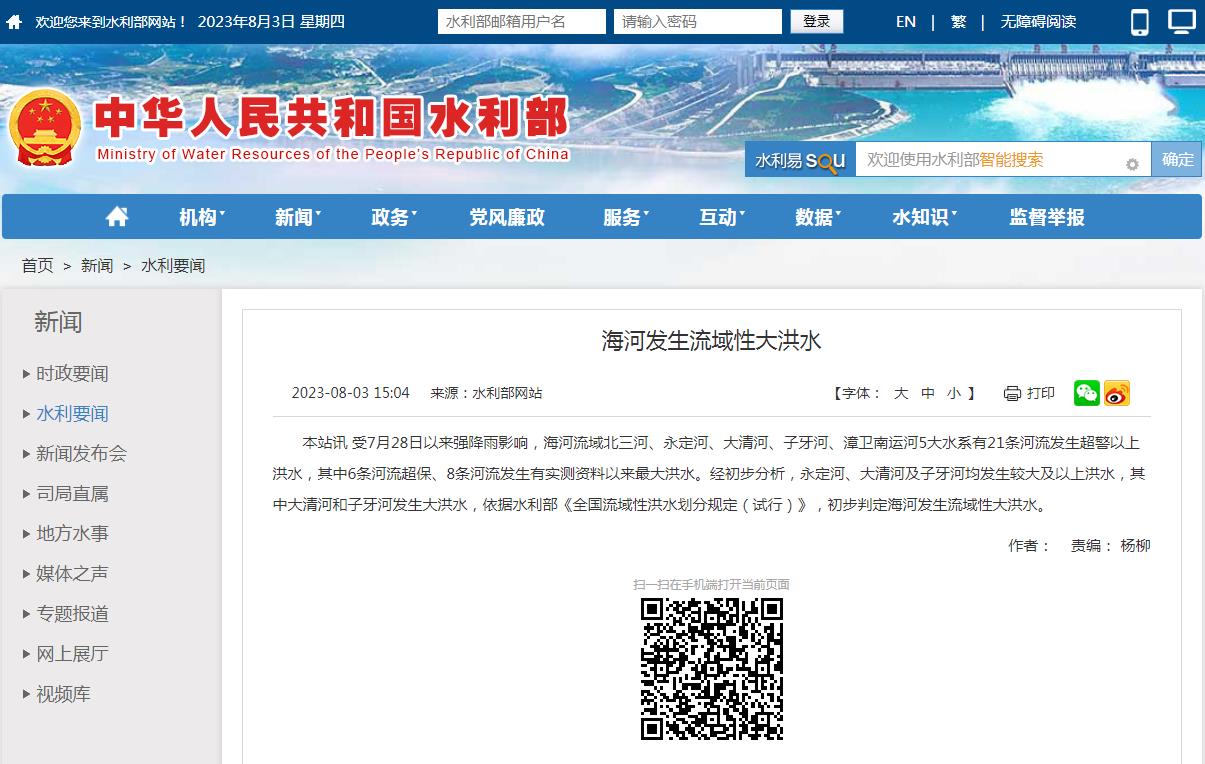 中新網(wǎng)8月3日電 據(jù)水利部網(wǎng)站3日消息,受7月28日以來強降雨影響,海河流域北三河、永定河、大清河、子牙河、漳衛(wèi)南運河5大水系有21條河流發(fā)生超警以上洪水,其中6條河流超保、8條河流發(fā)生有實測資料以來最大洪水。經(jīng)初步分析,永定河、大清河及子牙河均發(fā)生較大及以上洪水,其中大清河和子牙河發(fā)生大洪水,依據(jù)水利部《全國流域性洪水劃分規(guī)定(試行)》,初步判定海河發(fā)生流域性大洪水。