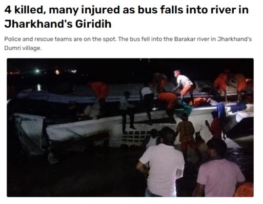 據(jù)報道,當?shù)鼐椒Q,當晚約20:40,在賈坎德邦(Jharkhand)的吉里迪(Giridih)縣,一輛從蘭契開往吉里迪的大巴車突然撞壞大橋欄桿,隨后墜入河流,橋梁高度約15米,造成至少4人死亡。預計還有幾人溺水身亡,救援行動正在進行中。